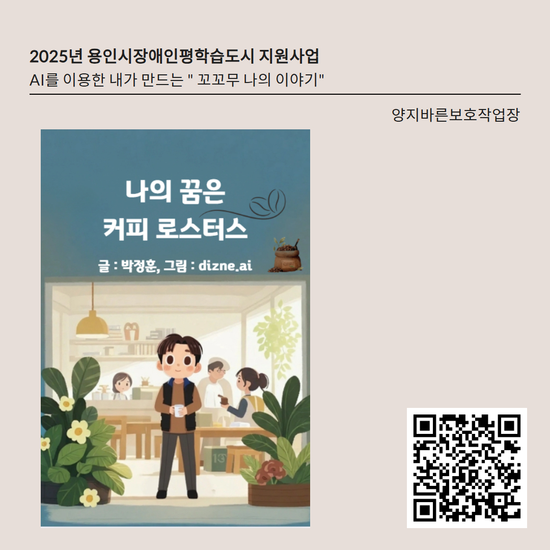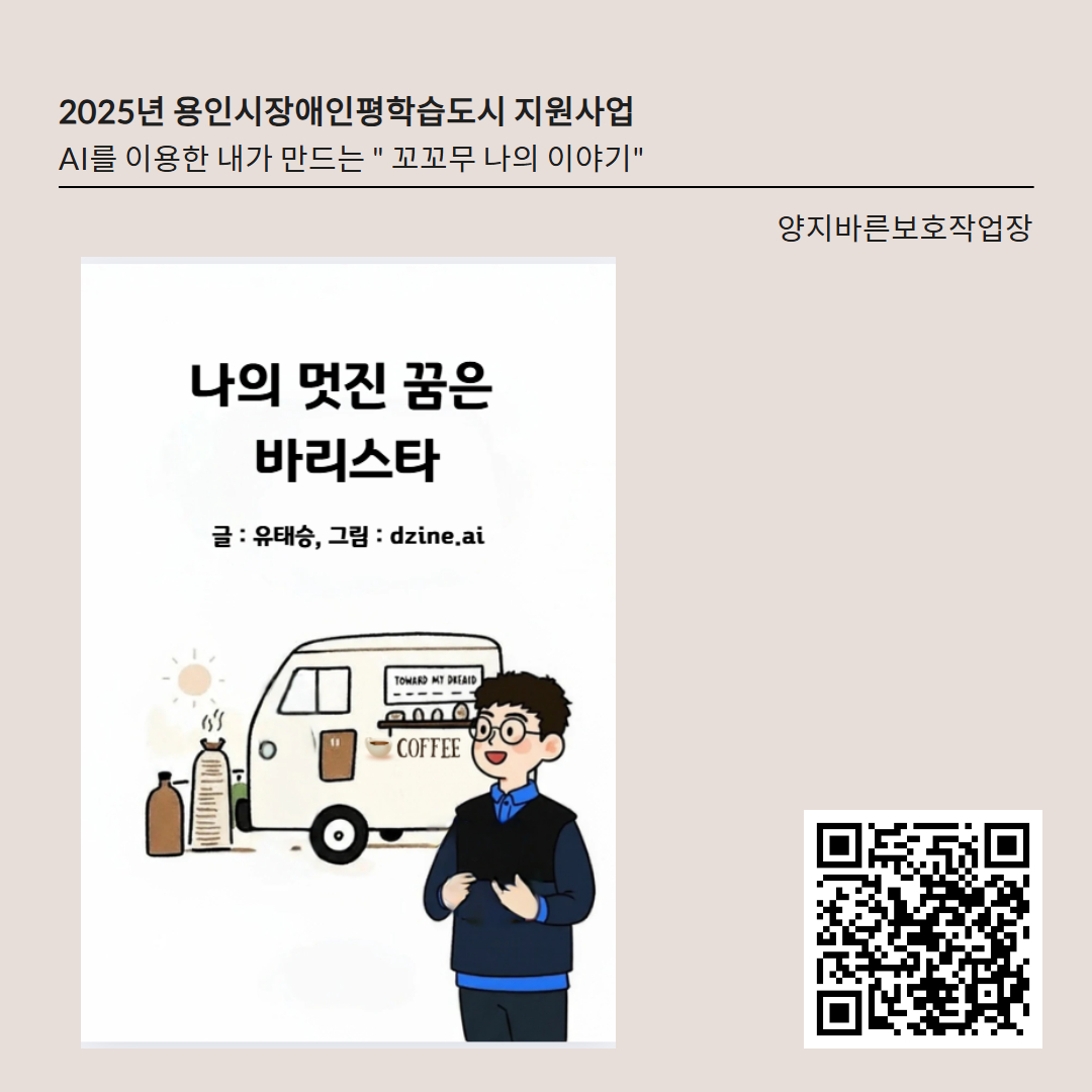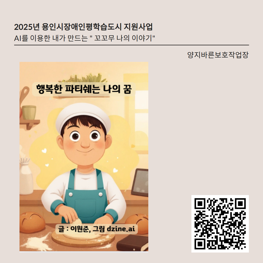 양지바른보호작업장에서는 2025년도 용인시로부터 장애인평생학습도시 프로그램으로 지원받아 중증근로장애인들에게 AI에 대한 활용 접근성을 향상시키기 위한 디지털 교육을 진행하였습니다. 이번 교육을 통해 본인이 하고 싶은 이야기를 글로표현하고, 다양한 AI 프로그램을 이용하여 본인이 직접 이미지와 책으로 편집하여 출간하였습니다. 각자의 개성, 다양한 스토리, 다양한 표현방법이 진솔하게 담겨져 만든 소중한 작품입니다.